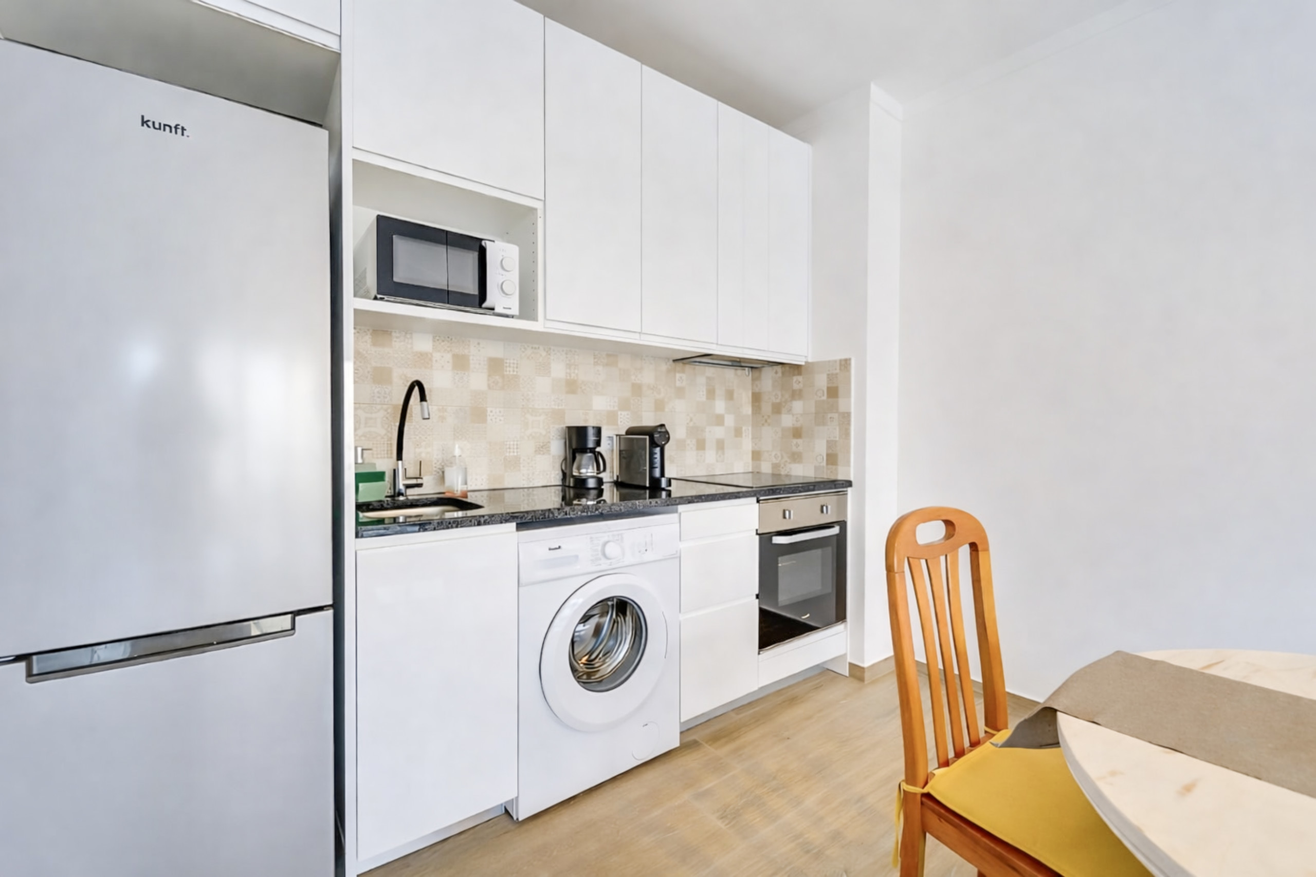 🍳 Cozinha: Forno, placa, micro-ondas, frigorífico e máquina de café.
