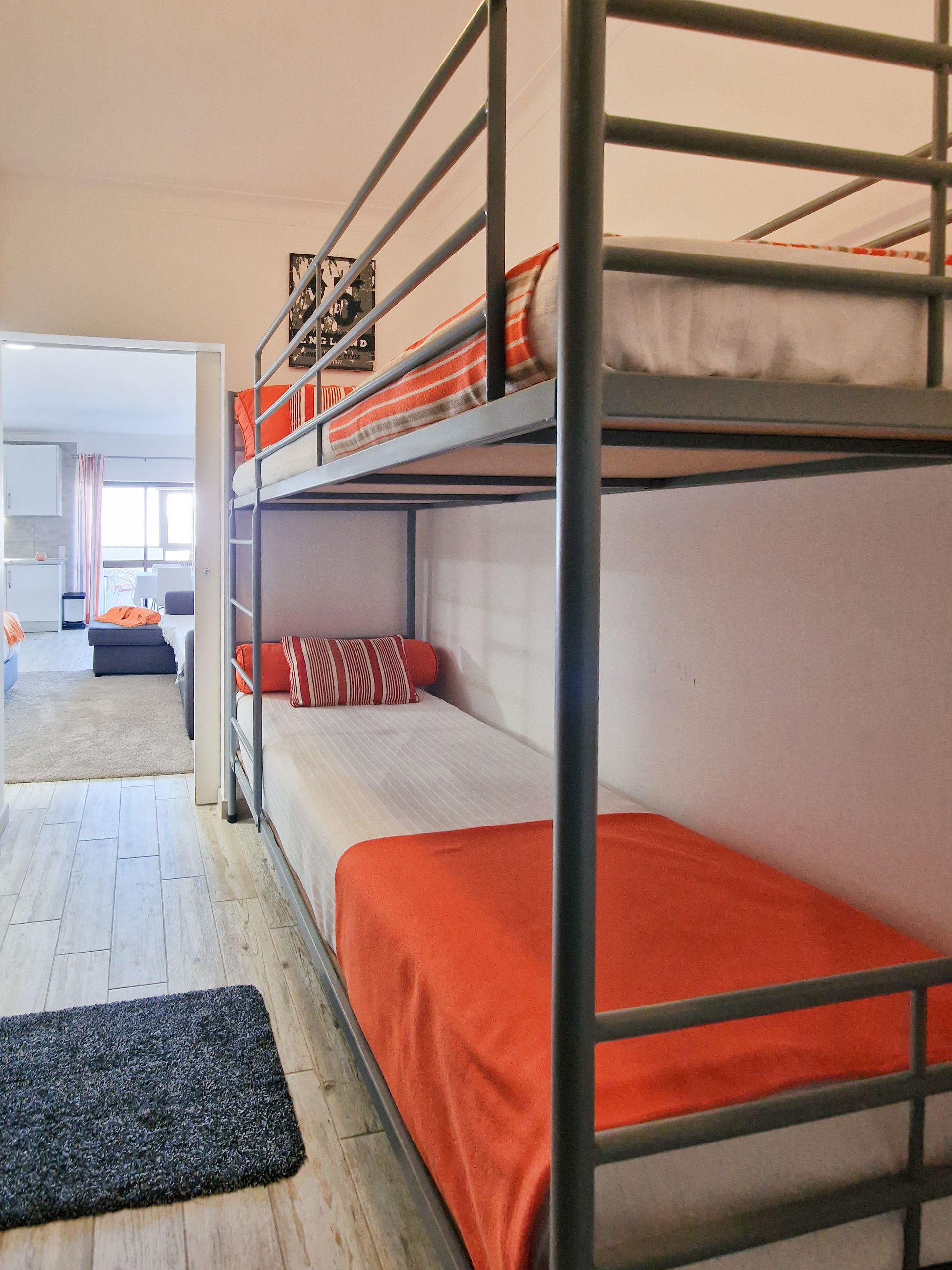 Inmueble compuesto por: entrada con 2 camas individuales en litera, sala con kitchenette, cama de matrimonio, 1 sofá-cama en la sala, aire acondicionado en la sala (frío y calor), 1 cuarto de baño con ducha, TV y WI-FI y un balcón con mesa y sillas, para disfrutar sus vacaciones.